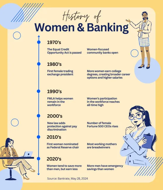 It may be hard to believe that women had so few financial and banking rights just a few decades ago. While today, more than half of all women are in the workforce, and women can’t be refused credit based on gender, in 1970, only 43% of women were in the labor force, and women could be turned away by lenders if they didn’t have a male co-signer.2